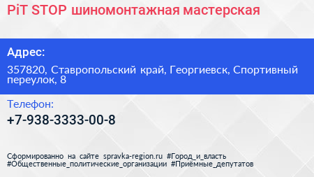 PiT STOP, шиномонтажная мастерская по адресу 357820, Ставропольский край, Георгиевск, Спортивный переулок, 8 в дальнейшем Организация, размещена в следующих категориях: