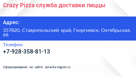 Crazy Pizza, служба доставки пиццы по адресу 357820, Ставропольский край, Георгиевск, Октябрьская, 66 в дальнейшем Организация, размещена в следующих категориях: