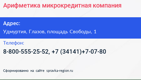 Арифметика, микрокредитная компания по адресу Удмуртия, Глазов, площадь Свободы, 1 в дальнейшем Организация, размещена в следующих категориях: