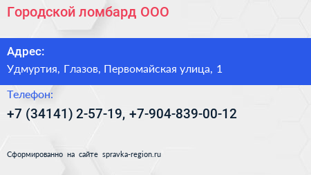 Городской ломбард, ООО по адресу Удмуртия, Глазов, Первомайская улица, 1 в дальнейшем Организация, размещена в следующих категориях: