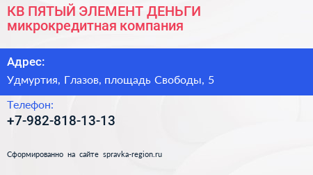 КВ ПЯТЫЙ ЭЛЕМЕНТ ДЕНЬГИ, микрокредитная компания по адресу Удмуртия, Глазов, площадь Свободы, 5 в дальнейшем Организация, размещена в следующих категориях:
