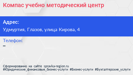 Компас, учебно-методический центр по адресу Удмуртия, Глазов, улица Кирова, 4 в дальнейшем Организация, размещена в следующих категориях: