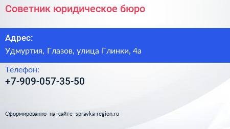 Советник, юридическое бюро по адресу Удмуртия, Глазов, улица Глинки, 4а в дальнейшем Организация, размещена в следующих категориях: