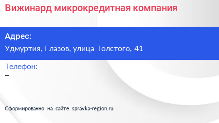 Вижинард, микрокредитная компания по адресу Удмуртия, Глазов, улица Толстого, 41 в дальнейшем Организация, размещена в следующих категориях: