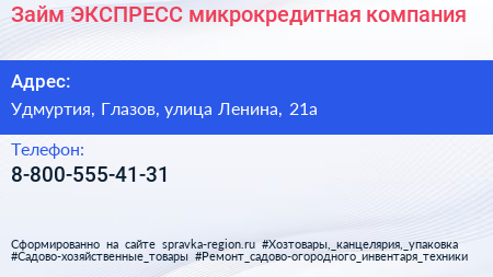 Займ ЭКСПРЕСС, микрокредитная компания по адресу Удмуртия, Глазов, улица Ленина, 21а в дальнейшем Организация, размещена в следующих категориях: