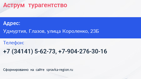 Аструм+, турагентство по адресу Удмуртия, Глазов, улица Короленко, 23Б в дальнейшем Организация, размещена в следующих категориях: