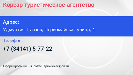 Корсар, туристическое агентство по адресу Удмуртия, Глазов, Первомайская улица, 1 в дальнейшем Организация, размещена в следующих категориях: