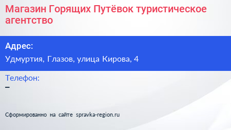 Магазин Горящих Путёвок, туристическое агентство по адресу Удмуртия, Глазов, улица Кирова, 4 в дальнейшем Организация, размещена в следующих категориях: