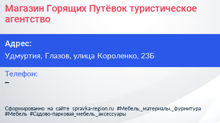 Магазин Горящих Путёвок, туристическое агентство по адресу Удмуртия, Глазов, улица Короленко, 23Б в дальнейшем Организация, размещена в следующих категориях: