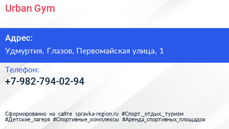 Urban Gym по адресу Удмуртия, Глазов, Первомайская улица, 1 в дальнейшем Организация, размещена в следующих категориях: