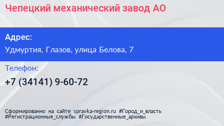 Чепецкий механический завод, АО по адресу Удмуртия, Глазов, улица Белова, 7 в дальнейшем Организация, размещена в следующих категориях: