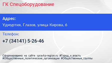 ГК Спецоборудование по адресу Удмуртия, Глазов, улица Кирова, 6 в дальнейшем Организация, размещена в следующих категориях: