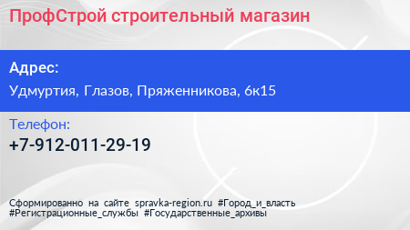 ПрофСтрой, строительный магазин по адресу Удмуртия, Глазов, Пряженникова, 6к15 в дальнейшем Организация, размещена в следующих категориях: