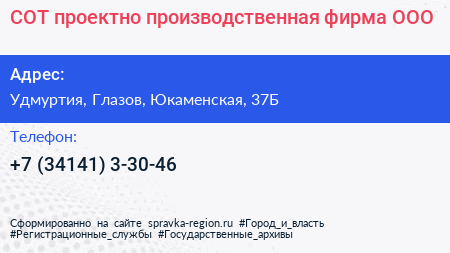 СОТ, проектно-производственная фирма, ООО по адресу Удмуртия, Глазов, Юкаменская, 37Б в дальнейшем Организация, размещена в следующих категориях: