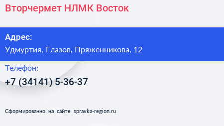 Вторчермет, НЛМК Восток по адресу Удмуртия, Глазов, Пряженникова, 12 в дальнейшем Организация, размещена в следующих категориях: