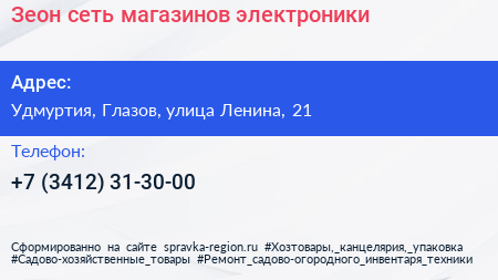 Зеон, сеть магазинов электроники по адресу Удмуртия, Глазов, улица Ленина, 21 в дальнейшем Организация, размещена в следующих категориях: