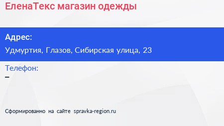 ЕленаТекс, магазин одежды по адресу Удмуртия, Глазов, Сибирская улица, 23 в дальнейшем Организация, размещена в следующих категориях: