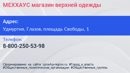 МЕХХАУС, магазин верхней одежды по адресу Удмуртия, Глазов, площадь Свободы, 1 в дальнейшем Организация, размещена в следующих категориях:
