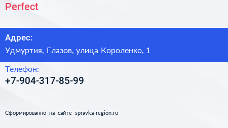 Perfect по адресу Удмуртия, Глазов, улица Короленко, 1 в дальнейшем Организация, размещена в следующих категориях: