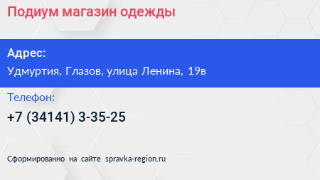 Подиум, магазин одежды по адресу Удмуртия, Глазов, улица Ленина, 19в в дальнейшем Организация, размещена в следующих категориях: