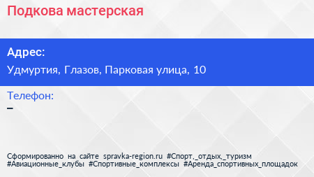 Подкова, мастерская по адресу Удмуртия, Глазов, Парковая улица, 10 в дальнейшем Организация, размещена в следующих категориях: