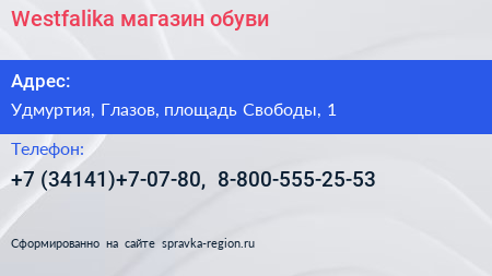 Westfalika, магазин обуви по адресу Удмуртия, Глазов, площадь Свободы, 1 в дальнейшем Организация, размещена в следующих категориях: