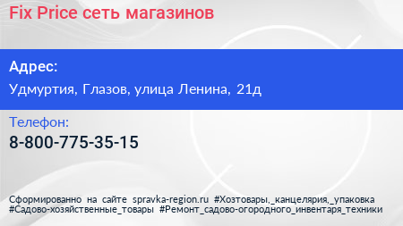 Fix Price, сеть магазинов по адресу Удмуртия, Глазов, улица Ленина, 21д в дальнейшем Организация, размещена в следующих категориях: