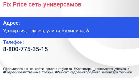 Fix Price, сеть универсамов по адресу Удмуртия, Глазов, улица Калинина, 6 в дальнейшем Организация, размещена в следующих категориях: