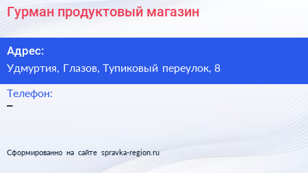 Гурман, продуктовый магазин по адресу Удмуртия, Глазов, Тупиковый переулок, 8 в дальнейшем Организация, размещена в следующих категориях: