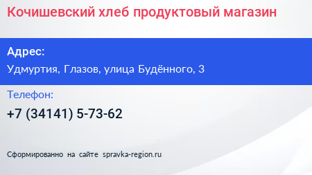 Кочишевский хлеб, продуктовый магазин по адресу Удмуртия, Глазов, улица Будённого, 3 в дальнейшем Организация, размещена в следующих категориях: