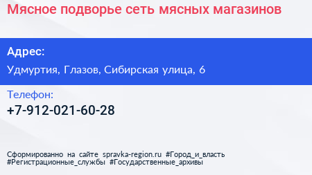 Мясное подворье, сеть мясных магазинов по адресу Удмуртия, Глазов, Сибирская улица, 6 в дальнейшем Организация, размещена в следующих категориях: