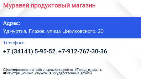 Муравей, продуктовый магазин по адресу Удмуртия, Глазов, улица Циолковского, 20 в дальнейшем Организация, размещена в следующих категориях: