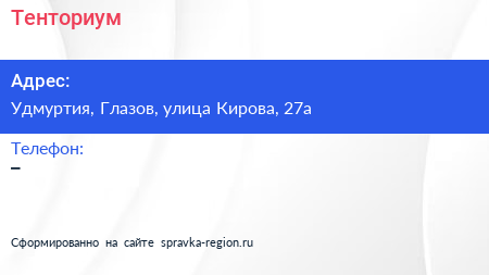 Тенториум по адресу Удмуртия, Глазов, улица Кирова, 27а в дальнейшем Организация, размещена в следующих категориях: