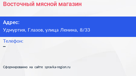 Восточный, мясной магазин по адресу Удмуртия, Глазов, улица Ленина, 8/33 в дальнейшем Организация, размещена в следующих категориях: