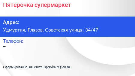 Пятерочка, супермаркет по адресу Удмуртия, Глазов, Советская улица, 34/47 в дальнейшем Организация, размещена в следующих категориях: