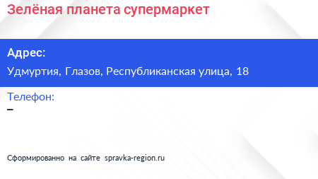 Зелёная планета, супермаркет по адресу Удмуртия, Глазов, Республиканская улица, 18 в дальнейшем Организация, размещена в следующих категориях: