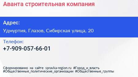 Аванта, строительная компания по адресу Удмуртия, Глазов, Сибирская улица, 20 в дальнейшем Организация, размещена в следующих категориях: