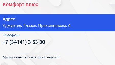 Комфорт плюс по адресу Удмуртия, Глазов, Пряженникова, 6 в дальнейшем Организация, размещена в следующих категориях: