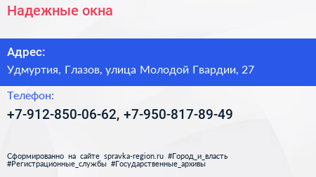 Надежные окна по адресу Удмуртия, Глазов, улица Молодой Гвардии, 27 в дальнейшем Организация, размещена в следующих категориях: