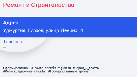 Ремонт и Строительство по адресу Удмуртия, Глазов, улица Ленина, 4 в дальнейшем Организация, размещена в следующих категориях: