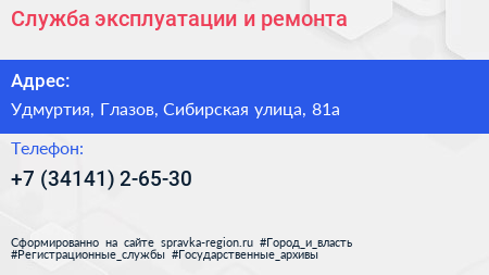 Служба эксплуатации и ремонта по адресу Удмуртия, Глазов, Сибирская улица, 81а в дальнейшем Организация, размещена в следующих категориях: