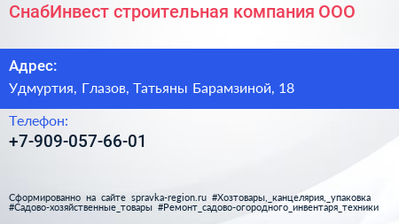 СнабИнвест, строительная компания, ООО по адресу Удмуртия, Глазов, Татьяны Барамзиной, 18 в дальнейшем Организация, размещена в следующих категориях: