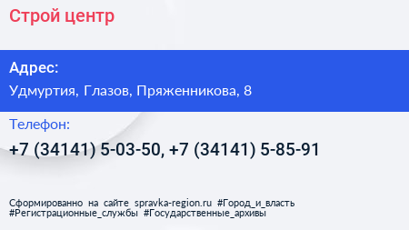 Строй-центр по адресу Удмуртия, Глазов, Пряженникова, 8 в дальнейшем Организация, размещена в следующих категориях: