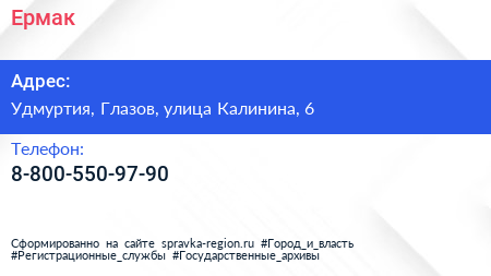 Ермак по адресу Удмуртия, Глазов, улица Калинина, 6 в дальнейшем Организация, размещена в следующих категориях: