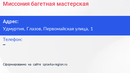 Миссония, багетная мастерская по адресу Удмуртия, Глазов, Первомайская улица, 1 в дальнейшем Организация, размещена в следующих категориях: