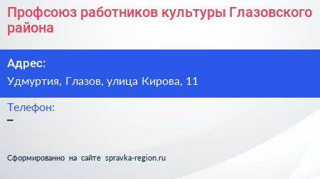 Профсоюз работников культуры Глазовского района по адресу Удмуртия, Глазов, улица Кирова, 11 в дальнейшем Организация, размещена в следующих категориях: