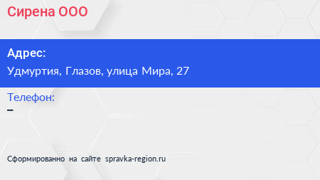 Сирена, ООО по адресу Удмуртия, Глазов, улица Мира, 27 в дальнейшем Организация, размещена в следующих категориях: