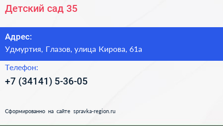 Детский сад №35 по адресу Удмуртия, Глазов, улица Кирова, 61а в дальнейшем Организация, размещена в следующих категориях: