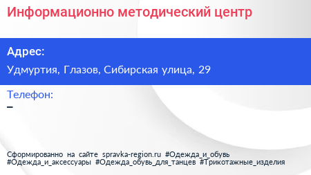 Информационно-методический центр по адресу Удмуртия, Глазов, Сибирская улица, 29 в дальнейшем Организация, размещена в следующих категориях: