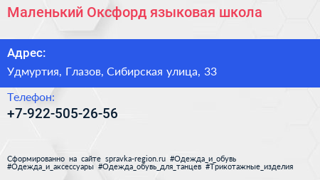 Маленький Оксфорд, языковая школа по адресу Удмуртия, Глазов, Сибирская улица, 33 в дальнейшем Организация, размещена в следующих категориях: